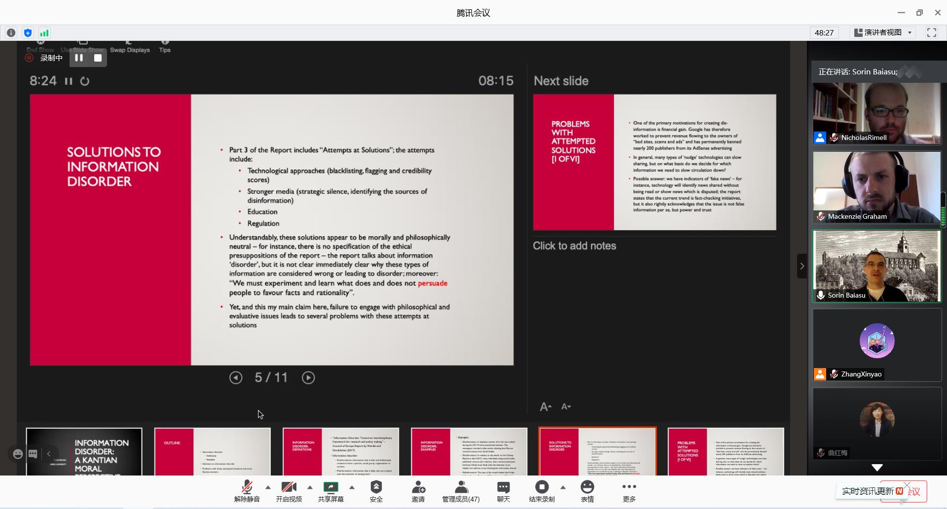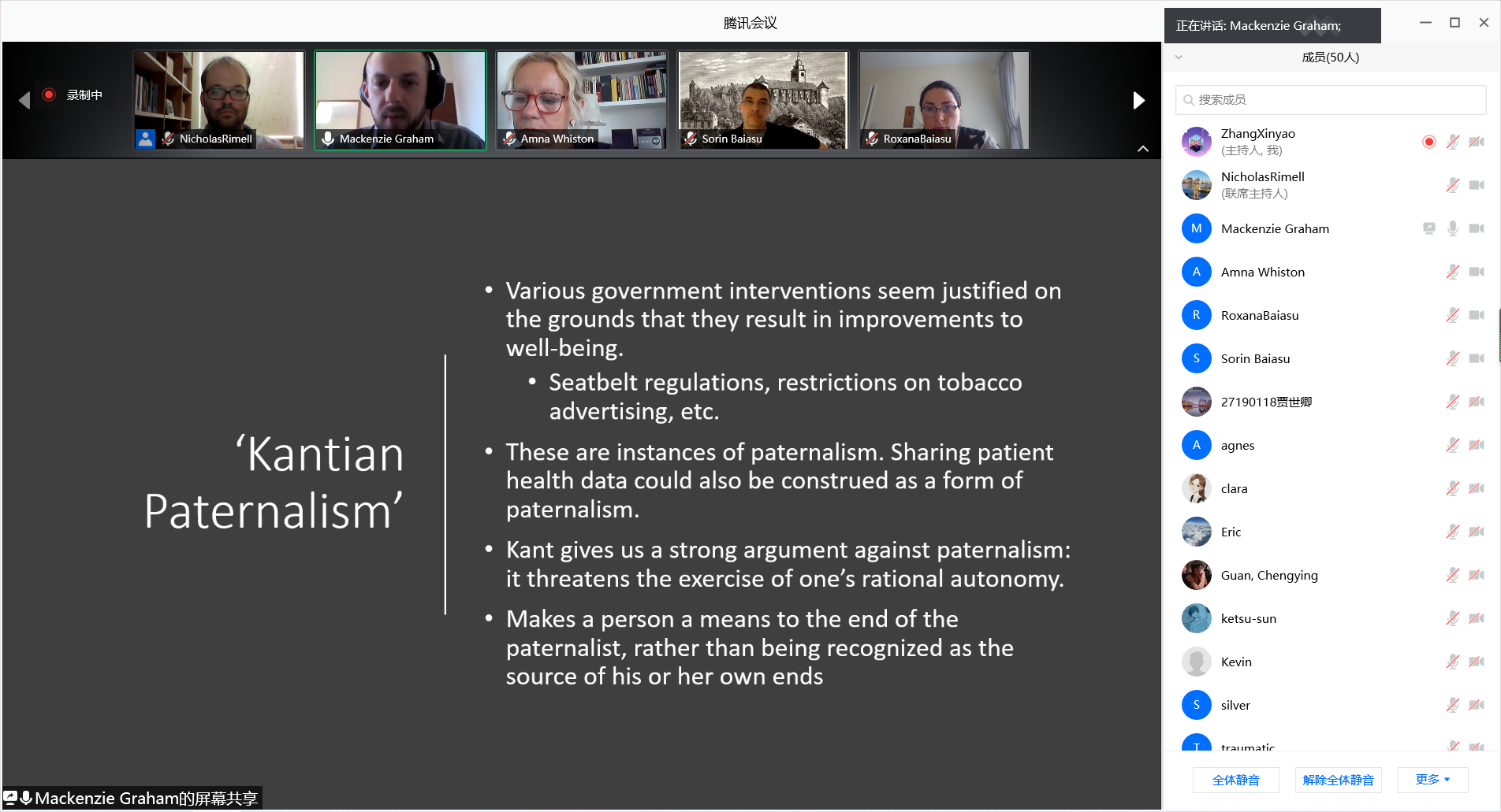 On September 19, 2020, the round-table entitled "Kant's Moral Philosophy and Future Society" was successfully held by the School of Philosophy and Sociology of Jilin University. was  held. Professor Sorin Baiasu from Keele University, Dr. Mackenzie Graham from Oxford University, Lecturer Roxana Baiasu from Oxford University, Dr. Chengying Guan from King's College London, Lecturer Amna Whiston from University of Oxford, and Professor Hongmei Qu from our school attended the meeting. The topics were discussed in depth.