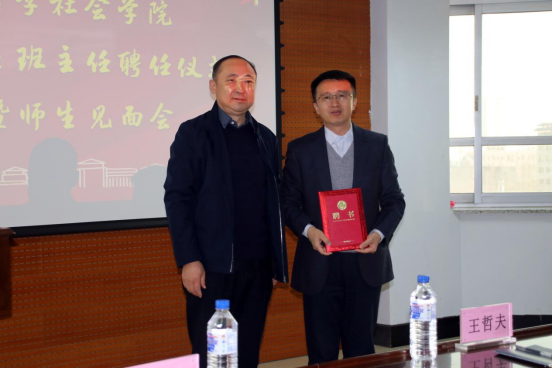2021级社会学类2班班主任,党委书记李佰志老师为王哲夫老师颁发了聘书。