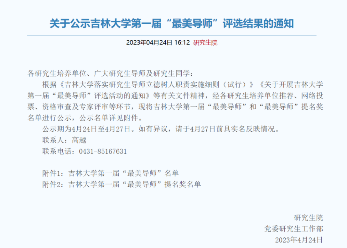根据《H视频 落实研究生导师立德树人职责实施细则(试行)》《关于开展H视频 第一届“最美导师”评选活动的通知》等有关文件精神,经各研究生培养单位推荐、网络投票、资格审查及专家评审等环节,拟定20位教师获H视频 第一届“最美导师”、“最美导师”提名奖。