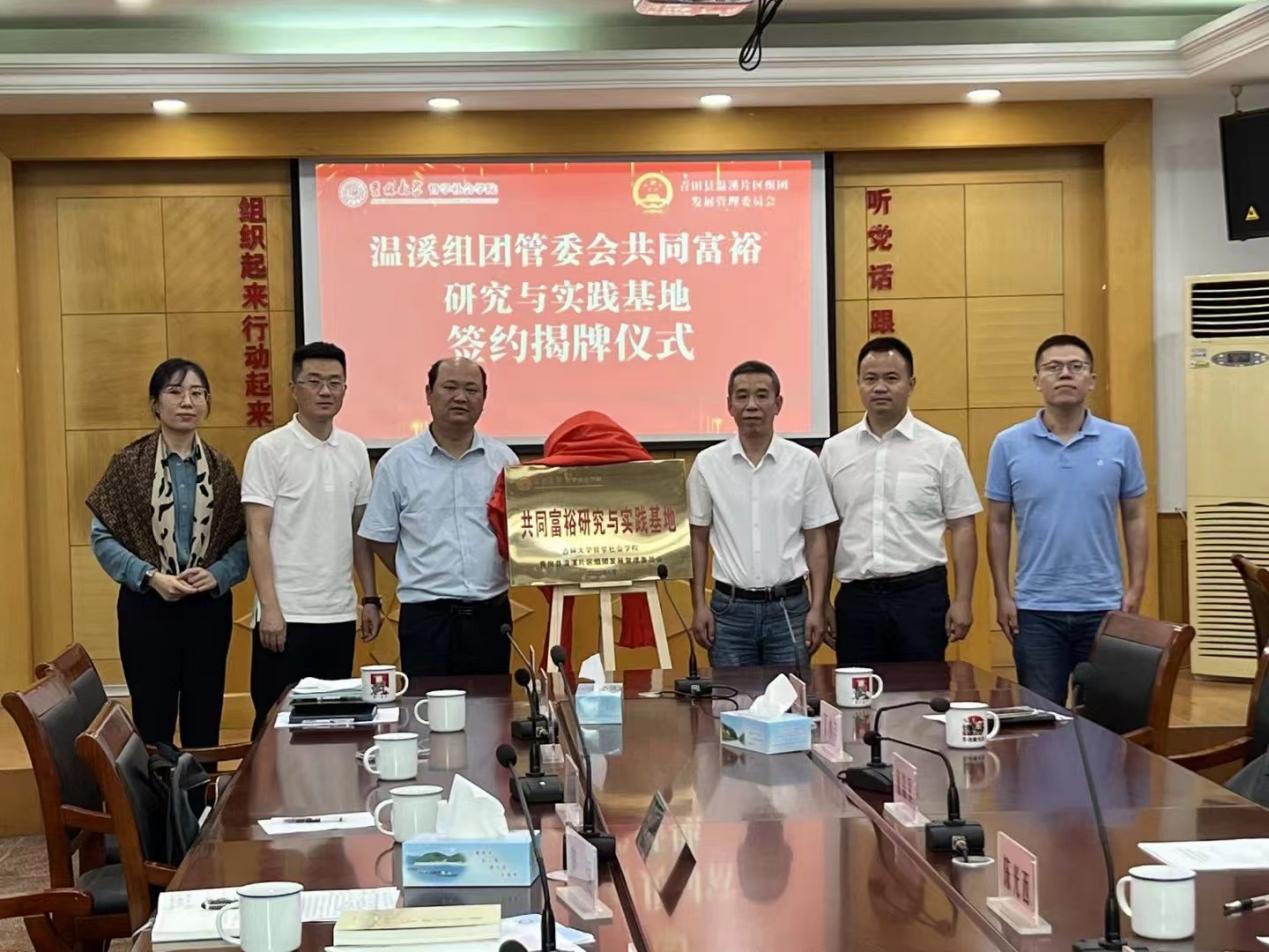 “共同富裕研究与实践基地”正式落地温溪镇,双方将携手共同探索实现小城市发展带动周边乡村实现共同富裕发展路径。青田县委常委、温溪组团管委会主任、温溪镇党委书记童森军主持仪式。学院副院长芦恒教授、温溪组团管委会常务副主任陈光西分别代表双方签订基地合作备忘录。学院党委副书记兼副院长刘培强、温溪组团管委会主任童森军共同为共同富裕研究与实践基地揭牌。