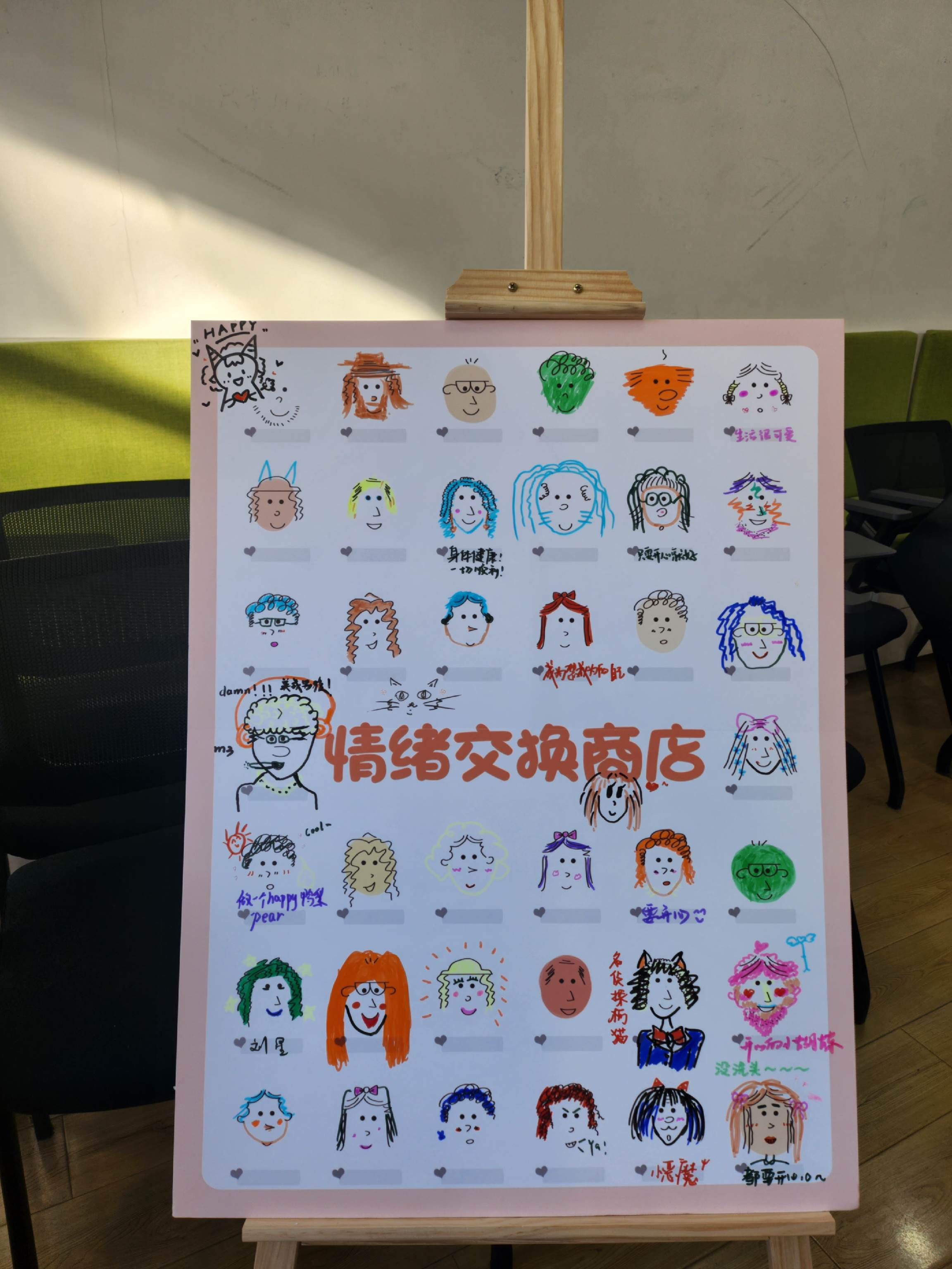其次是“爱自己的100种方式”环节,同学们在留言板上写下专属于自己的治愈解压方式,与其他同学分享,并用现场提供的笑脸、点赞贴纸等表情表达自己被这些“爱自己”的方式安利并引发了共鸣。在情绪绘画板上,大家充分发挥自己的想象力,为KT板上的涂鸦表情添加五官、头发、装饰等,通过同学们的创作,一个个生动形象的小人脸跃然纸上,不仅展现了同学们丰富的想象力,也体现了同学们五彩斑斓的情绪。各种表情交相辉映,构成了一幅栩栩如生的画卷。