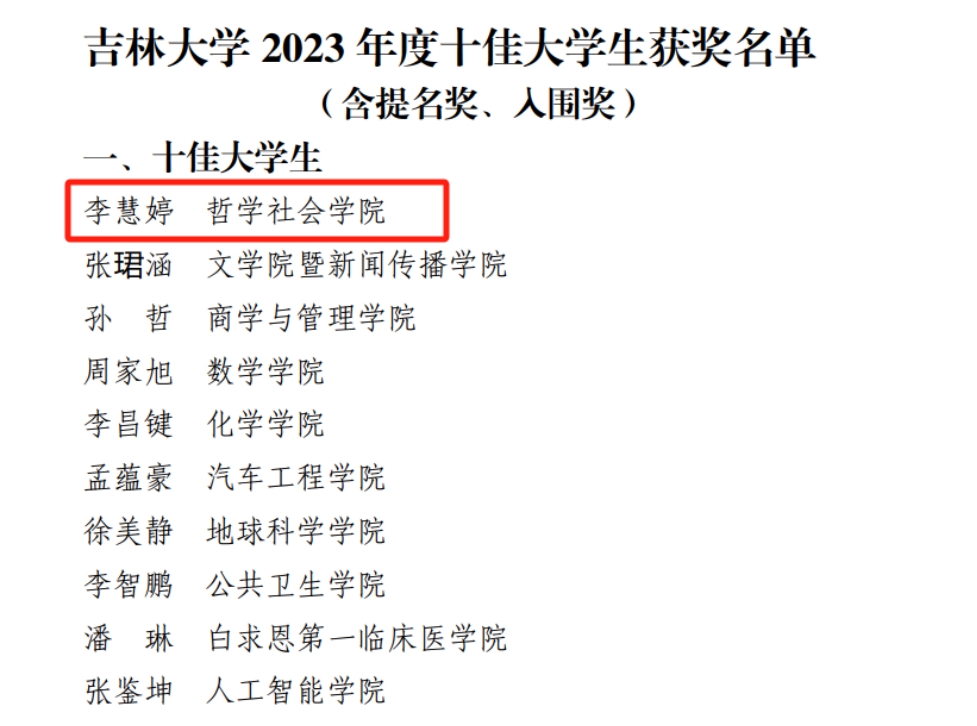 2023年度十佳大学生等优秀学生和集体评选结果公布,经过学生申请、学院推荐、材料审查、终评答辩等环节,我院2020级劳动与社会保障专业本科生李慧婷同学在全校众多候选人中脱颖而出,荣获H视频