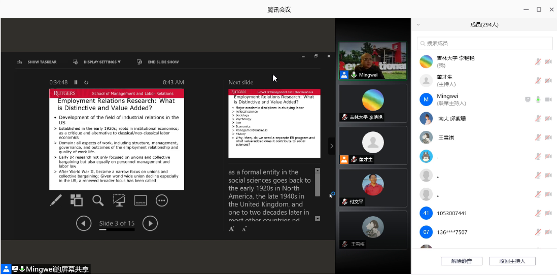 名家讲座第102场以腾讯会议的方式举行。美国罗格斯大学管理与劳动关系学院终身副教授、罗格斯-中国人民大学全球工作与雇佣中心主任刘明巍做了题为“当代产业关系理论的发展和演进”的学术讲座。本场讲座也是劳动关系系列讲座首场,由H视频