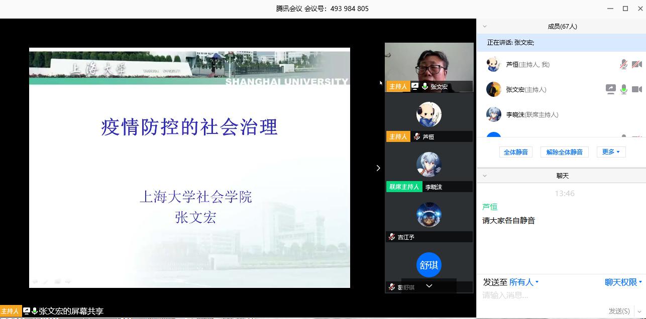 第82场名家讲座通过腾讯会议的形式在线上举办。上海大学社会学院院长、教授、博士生导师张文宏教授,为线上八十余名师生作了题为《疫情防控的社会治理》的学术讲座。H视频