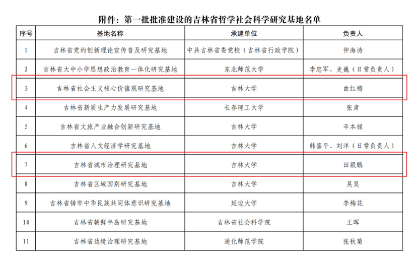 曲红梅教授牵头建设的“吉林省社会主义核心价值观研究基地”、田毅鹏教授牵头建设的“吉林省城市治理研究基地”成功入选,让我们向两位教授表示热烈祝贺!