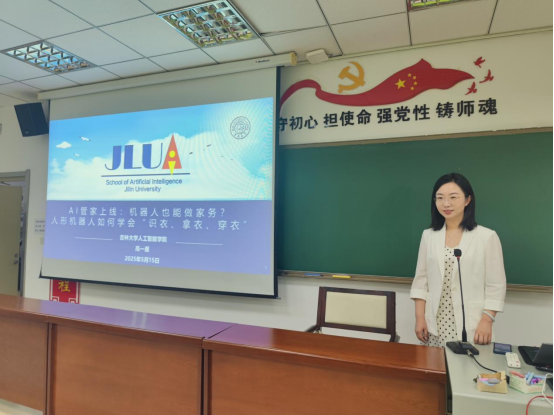 高一星老师向同学们详细介绍了她的科研团队在人形机器人柔性衣物操作技术方面的研究进展,具体包括机器人如何利用多模态感知信息进行“识衣、拿衣、穿衣”,通过视频和动画演示向同学们展示了机器人如何进行衣物感知、识别、理解以及人-机-物交互动作规划背后的核心技术原理。最后,高老师就人形机器人在未来家政服务与智慧养老中的应用前景与师生们展开了深入探讨。