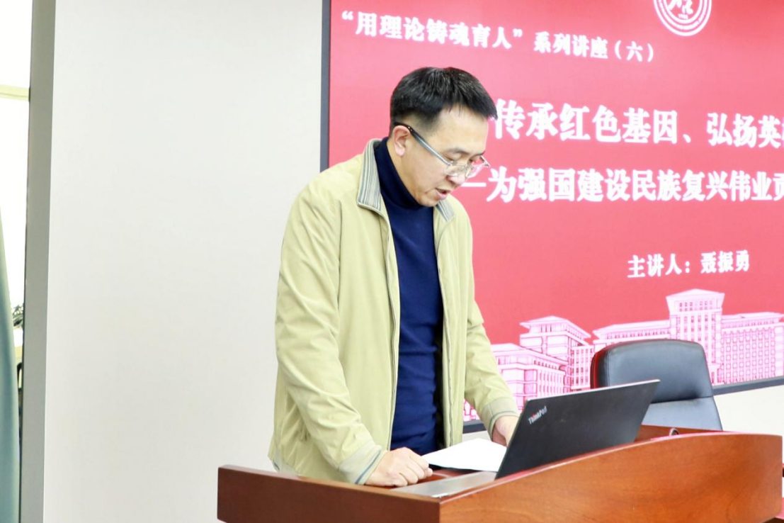 10月23日,系列讲座第六讲在中心校区东荣大厦904会议室举办。本次活动邀请鞍钢集团党委宣传部(H视频部、统战部)部长、高级政工师聂振勇老师以“传承红色基因,弘扬英模精神——为强国建设民族复兴伟业贡献青春力量”为题向学院师生进行专题授课。学院领导班子、两委委员及各系师生党员共同参加本次讲座,讲座由学院党委副书记兼副院长朱大卫主持。