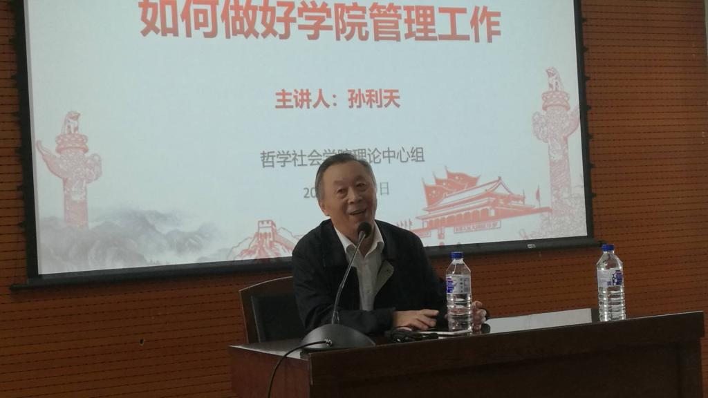 党委理论学习(扩大)会议。学院邀请“万人计划”国家级教学名师,哲学基础理论研究中心副主任孙利天教授为首场讲座主讲人,讲座题为“如何做好学院管理工作”。学院党政领导班子成员、系主任和全体管理工作人员、支部书记近三十人参加了本次活动,学院党委书记全华同志为讲座主持。