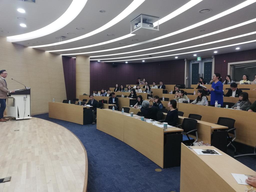 5月7日上午,交流团来到了首尔外籍流动女性咨询中心,听取金泰姬主任的报告。金主任介绍了中心的基本结构,并对包括家庭暴力、家庭矛盾、夫妻矛盾、性暴力等问题传授了专业服务的经验。交流团就韩国社会的基本福利保障服务、家庭服务、社工服务等问题与金主任进行了热烈的探讨。5月7日下午,交流团来到了成均馆大学的儒学学院,听取朴素晶教授的学术讲座。朴素晶副教授梳理了韩国哲学在东亚的发展脉络,通过对《三国遗史》中檀君神话的阐释,分析了韩国哲学的自我认同问题。