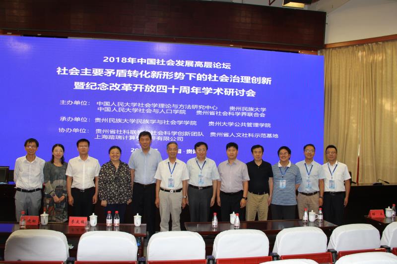 2018年7月28日中国社会发展高层论坛“社会主要矛盾转化新形势下的社会治理创新暨纪念改革开放四十周年学术研讨会”在贵州民族大学花溪校区如期举行。会议由中国人民大学社会学理论与方法研究中心、贵州民族大学、中国人民大学社会与人口学院、贵州省社会科学界联合主办。本次会议针对“改革开放推动中国社会发展的伟大成就和历史经验以及中国社会主要矛盾转化的深远意义、社会主义新时代改革开放的新任务与新战略、不平衡不充分发展的时空展现与社会问题”等相关议题进行深刻研讨。来自全国高校、科研院所、期刊杂志、政府相关部门的专家学者和学生代表300余人参加了此次会议。H视频