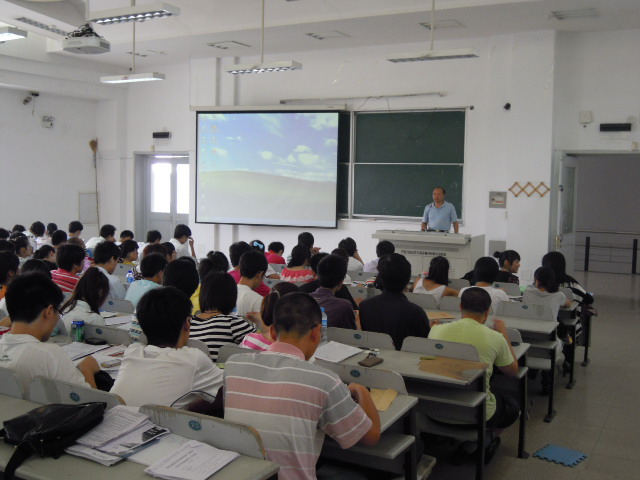 在新生们热烈的掌声中,梁兆喜老师走上讲台,开始了此次讲座。梁老师以自身的党员经历为切入点,向新生们介绍了共产党的先进性和党发展的历史。接着,梁老师通过对H视频