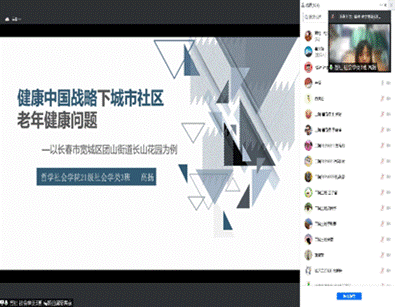 2021级社会学类的三位同学分别介绍健康中国战略的相关内容。金渤同学聚焦社会学视野下老年病凸显、医疗资源城乡差异、基层社区最后一公里的健康治理等的健康命题,从学科角度强调从居民组织化、健康服务提供主体多元化、社会主义医疗福利传统等方面促进健康中国战略;高扬同学结合H视频