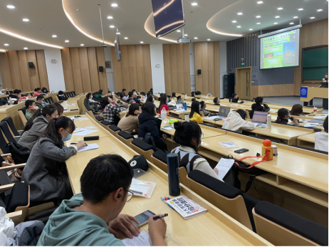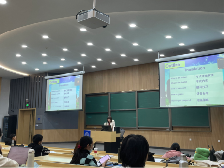 公共外语学院的宋芳菲教授聚焦翻译类题目来讲授。宋芳菲教授拥有海外语言学博士学历,是英国诺丁汉大学访问学者,曾参与高考、四六级考试、研究生入学考试等一系列重要考试的阅卷工作,也拥有丰富的一线教学经验。宋老师以雄厚的实力和丰富的经验吸引、感染了同学们,同学们踊跃参与,努力学习提升自己的英语能力和水平。