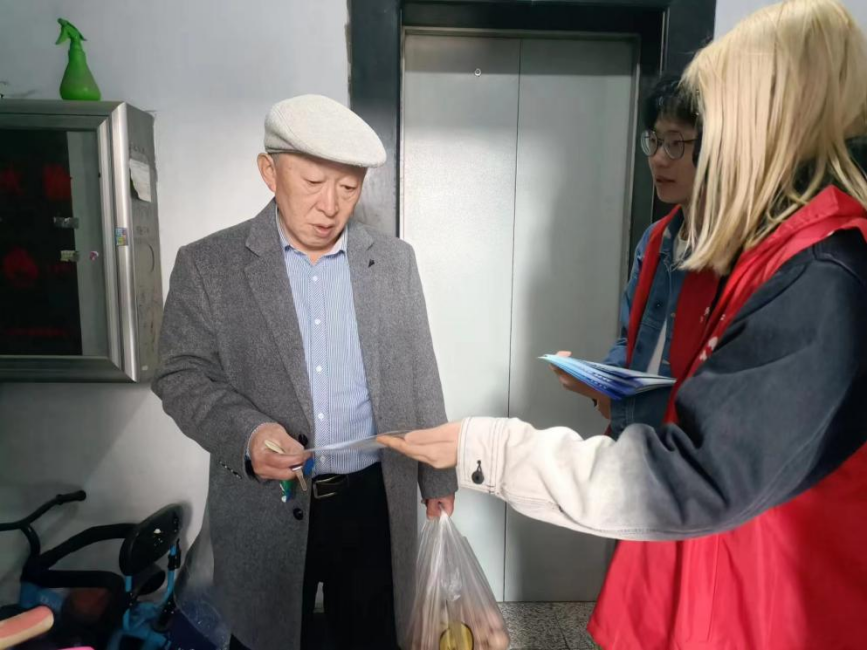 志愿者同学们迅速分工、入户进门,将宣传制品及时送到每位居民手中。上楼下楼的攀爬过程,挥洒的是哲社青年的汗水,收获的是哲社青年的感动,彰显的是哲社青年洋溢的劳动热情!