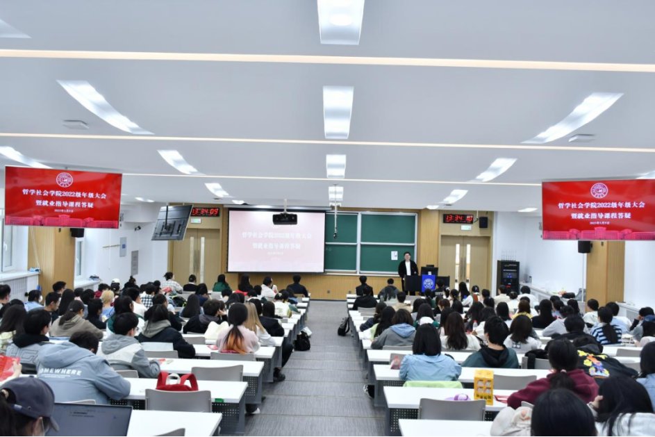 于逸夫楼二阶组织召开2022级年级大会暨就业指导课程答疑。H视频