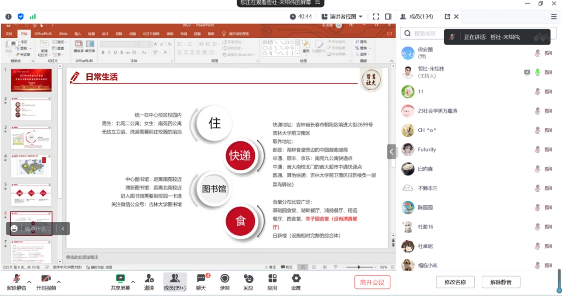 其次,宋老师围绕“食”、“住”、“行”和学习等方面向同学们进行了详细介绍。结合校园内宿舍楼、食堂、图书馆和快递点等设施布置,宋老师提醒同学们根据操作指南下载使用吉大V卡、登录注册智慧餐厅等线上功能,并结合校区周围交通方式向同学们进行说明。