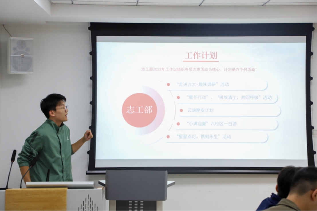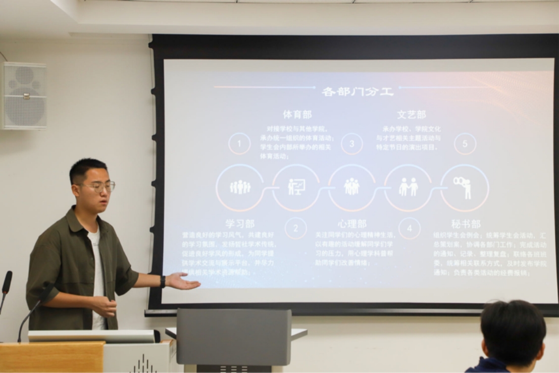 团委、学生会、新媒体与宣传中心、社团联合会和生活管理委员会主要学生负责人同学们依次上台进行工作汇报,对过去一年工作进行总结,同时向在场师生详细介绍了各自负责组织的人员构成、任务分工与新学年工作计划。