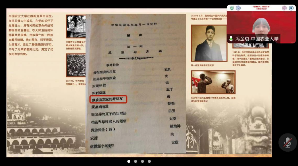 2020级本科生李慧婷主持,中国农业大学党委理论学习宣讲团博士分团第四届团长、第五届党支部书记冯金璐进行理论宣讲,来自三地四校的学生党员、共青团员们进行心得分享,H视频