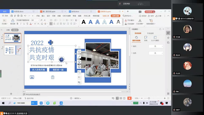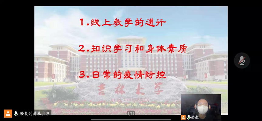2021级4班开展“共抗疫情,共克时艰”主题班会,主要围绕防疫工作、线上学习、日常生活和心理辅导四个内容展开,房安国同学对同学们的身心健康提出了特别关切。相信大家团结一致、同舟共济一定能共同克时艰、战胜疫情!