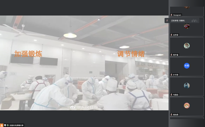 2021级3班由刘俊杉同学向大家介绍了当前校内疫情防控的相关内容,并向同学们提出了在防疫隔离期间注意体育锻炼和积极调节情绪的建议。通过播放情绪调控相关视频以及团支部建设为主题开展相关活动动员,为大家“排忧解难”。