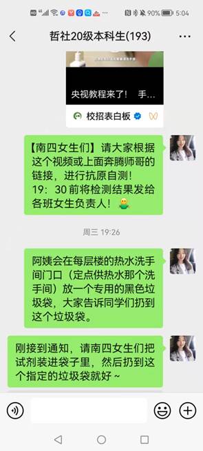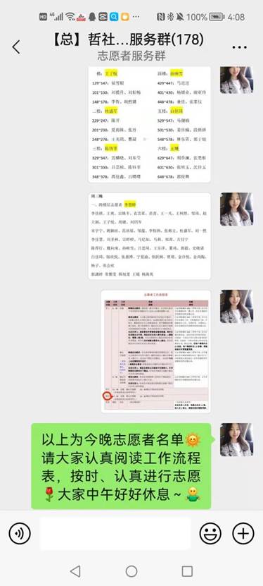 封寝当天,在学院书记和老师们的领导下,南四哲社女生组建了100多人在内的志愿者服务群,我也开始全面负责志愿者们的所有工作,扛起了这面大旗。作为哲社女生负责人,我加入了南四负责人总群,开始全面对接南四的老师,并频繁和其他学院同学沟通联络。我悄悄地立下了一个flag:一定不能辜负老师和志愿者同学们对我的期望,一定要尽力照顾到每位师姐师妹和同学们的需求,帮助南四姐妹们度过一个美好的封寝生活。