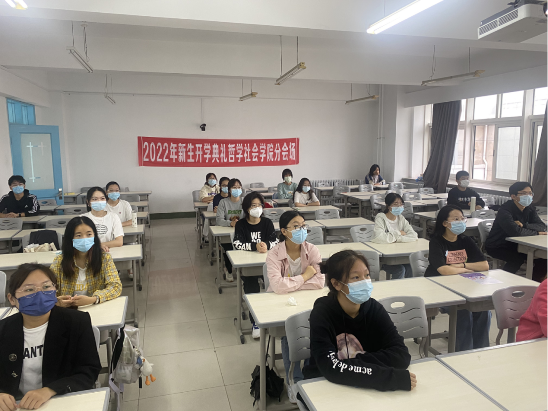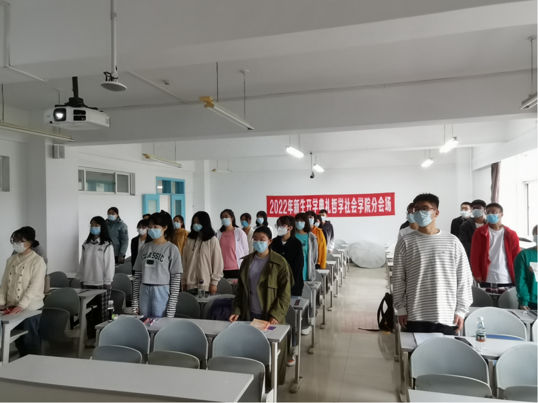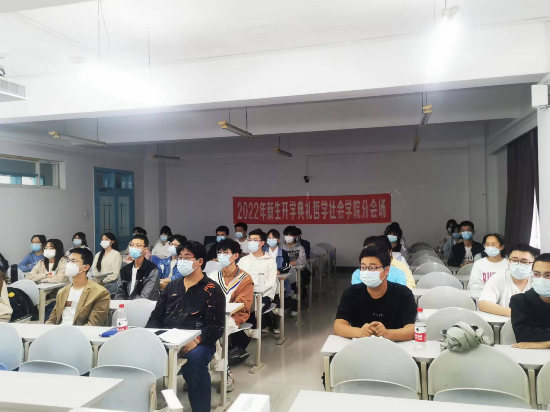 迎来了2022级两万余名新同学,为学校带来了新的血液,为校园注入了新的生机与活力。各分会场的哲社学子们整齐落座,精神高涨,在全场奏唱国歌后,典礼正式开始。