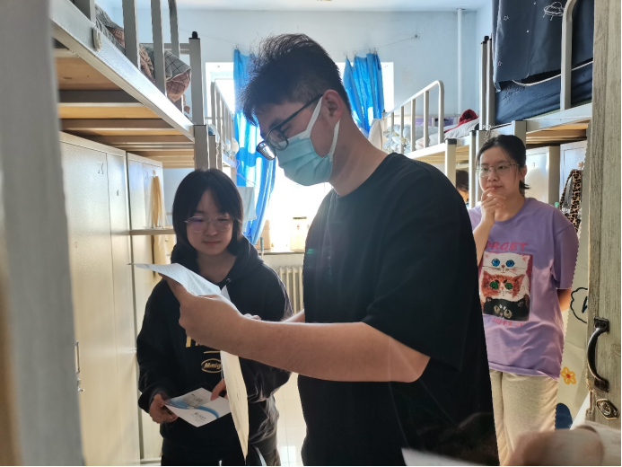 走进因疫情原因刚刚入校报到学生的寝室,宋老师和辅导员助理们从课程学习、生活适应、寝室关系等多个角度与新同学开展了积极交流,并重申了学校的相关纪律要求,提醒同学们尽快调整状态,积极融入群体,认真学习、快乐生活。
