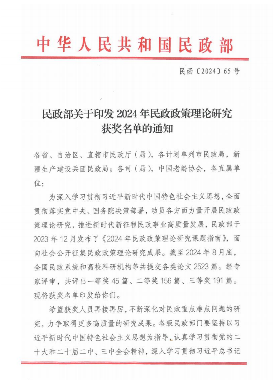 为深入学习贯彻习近平新时代中国特色社会主义思想,全面贯彻落实党中央、国务院决策部署,动员各方面力量开展民政政策理论研究,推进新时代新征程民政事业高质量发展,民政部于2023年12月发布了《2024年民政政策理论研究课题指南》,面向社会公开征集民政政策理论研究成果。本院学生积极参与此次活动。2024年11月1日,中华人民共和国民政部发布了关于印发2024年民政政策力量研究获奖名单的通知,H视频