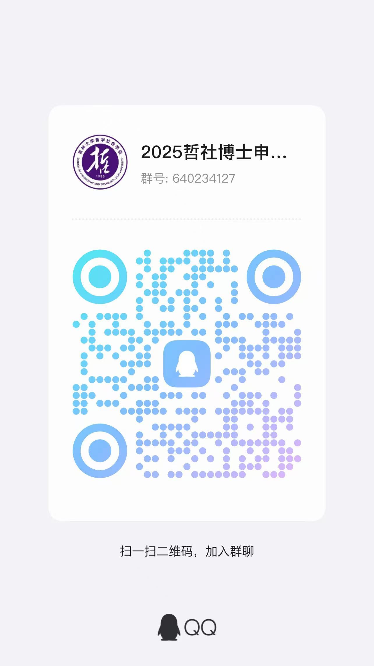 复试 QQ 群号:640234127,(进群时请报名姓名+专业,请进群后实名备注)“2025哲社博士申请考核复试群”,后续具体考试信息都将在此群内通知,不在学院主页发布,望周知。