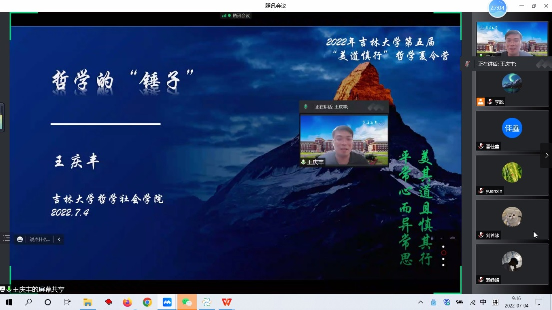 2022年“美道慎行”哲学夏令营的全国各高校优秀学子们作了以“哲学的‘锤子’”为题的学术讲座。本次报告由哲学系党支部李聪书记主持。