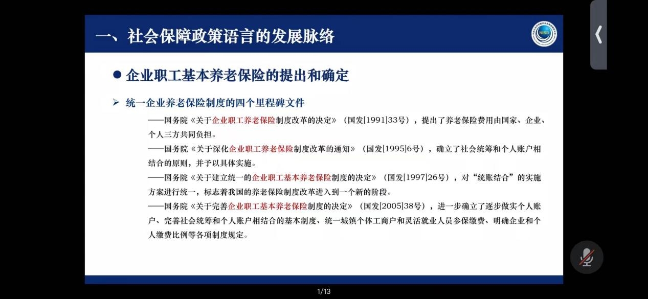 韩克庆教授首先由“社会保障政策语言的混用现状以及该如何走向规范化”引入讲座主题。目前国内的社会保障研究中,存在一种较为普遍的情形是政策语言和学术概念的混杂使用。以“企业职工基本养老保险的提出和确定”、“城镇职工基本养老保险的提出和混用”为例,韩教授对社会保障政策语言的发展脉络进行了详细梳理,并指出在统一企业养老保险制度的四个里程碑文件以及其他政策性文件中“企业职工养老保险”、“企业职工基本养老保险”、“城镇企业职工养老保险”、“城镇职工养老保险”存在混用现象,且在有关数据的统计口径上又明显地表明了企业职工基本养老保险和机关事业单位工作人员养老保险被归集为城镇职工基本养老保险的事实。