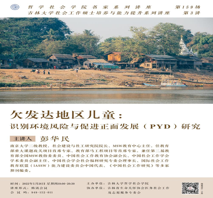 社会工作硕士培养与能力提升系列讲座”第3讲——《欠发达地区儿童:识别环境风险与促进正面发展(PYD)研究》,以线上会议的方式如期举行。该活动的协办单位为吉林省生命关怀协会医务社会工作及志愿服务专业委员会。本次讲座嘉宾是南京大学二级教授、博士生导师、社会建设与社工研究院院长彭华民老师,兼任教育部重大课题攻关项目首席专家、教育部马工程首席专家、第二届教育部全国MSW教指委委员、中国社会工作教育协会副会长、中国社会工作学会学术委员会副主任、中国社会学会社会福利研究专委会理事长、国际社会工作教育联盟(IASSW)能力建设委员会中国代表。本次讲座由副院长芦恒教授主持,院长田毅鹏教授及百余名师生线上参加了此次会议。