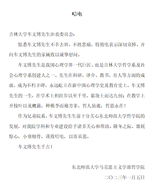 东北师范大学马克思主义学部哲学院唁电