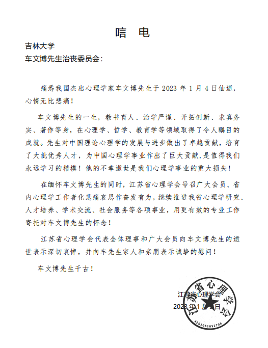 江苏省心理学会唁电