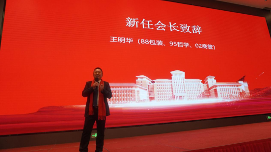 杰出校友王明华当选新任会长并发表热情洋溢的致辞。王明华会长表示校友会要服务校友,服务母校,服务社会,要加强产学研合作,让学校的科技成果落地,转化为生产力,这是一件非常有意义的事情。最后王明华会长用孙正聿老师常讲的“人是有意义的存在”与大家共勉。
