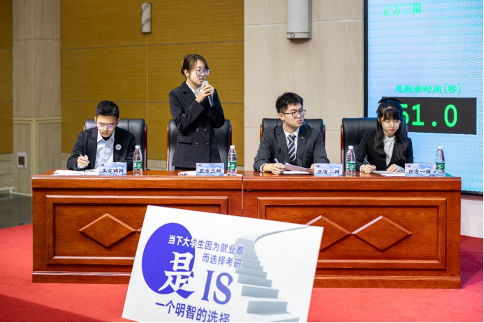 决赛中,双方辩手围绕“当下大学生因为就业难而选择考研是/不是一个明智的选择”这一辩题进行激烈讨论。是因为本科就业难就逃避就业转去考研,还是为了提升自己寻找人生的意义与方向而考研?正反双方围绕自己的立论为老师和同学们带来了一场精彩绝伦的视听盛宴。且看你来我往,针锋相对,字字珠玑,引得在场观众掌声连连。