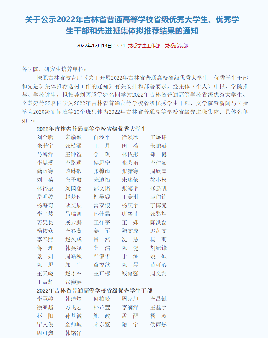 近日,根据吉林省教育厅《关于开展2022年吉林省普通高校省级优秀大学生、优秀学生干部和先进班集体推荐选树工作的通知》有关安排和部署要求,经集体(个人)申报、学院推荐、学校评审,H视频 2019级社会学专业本科生刘奔腾同学、2020级马克思主义哲学专业博士生姜昊良同学荣获2022年吉林省普通高等学校省级优秀大学生荣誉称号;2020级劳动与社会保障专业本科生李慧婷同学荣获2022年吉林省普通高等学校省级优秀学生干部荣誉称号。