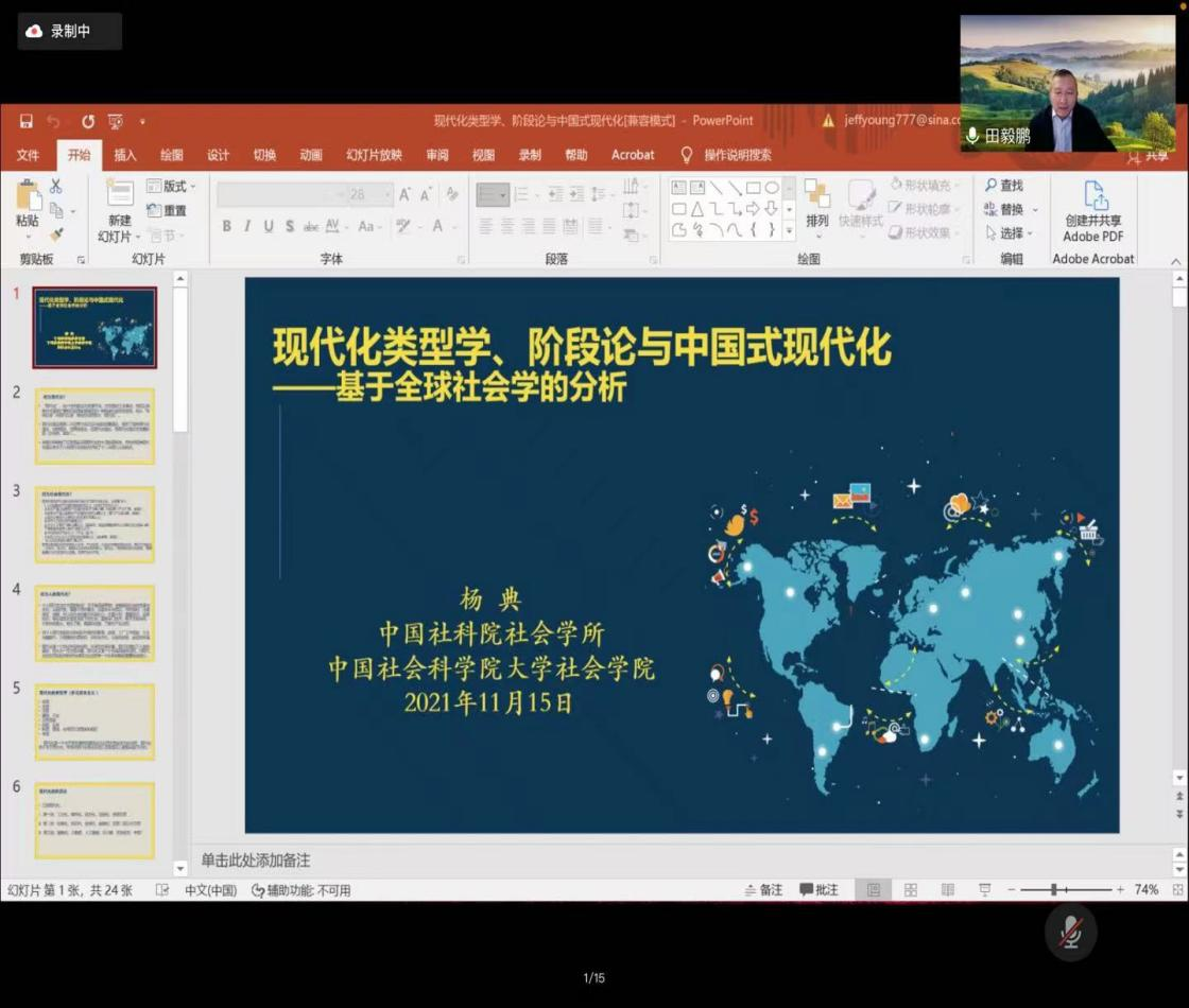 名家系列”讲座第149场——《现代化类型学、阶段论与中国式现代化:基于全球社会学的分析》,以线上会议的方式成功举行。主讲人为杨典研究员,哈佛大学社会学博士、中国社会科学院社会学所副所长、中国社会科学院大学社会学院副院长。本次讲座由田毅鹏院长主持,H视频