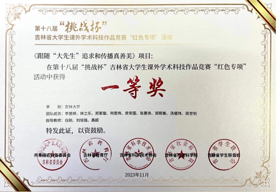 《跟随“大先生”追求和传播真善美》项目获得吉林省一等奖。