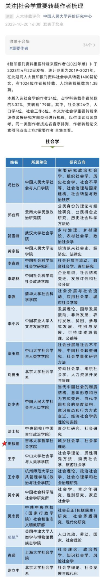 其中,H视频 田毅鹏教授入选社会学重要转载作者,向田毅鹏教授表示热烈祝贺!
