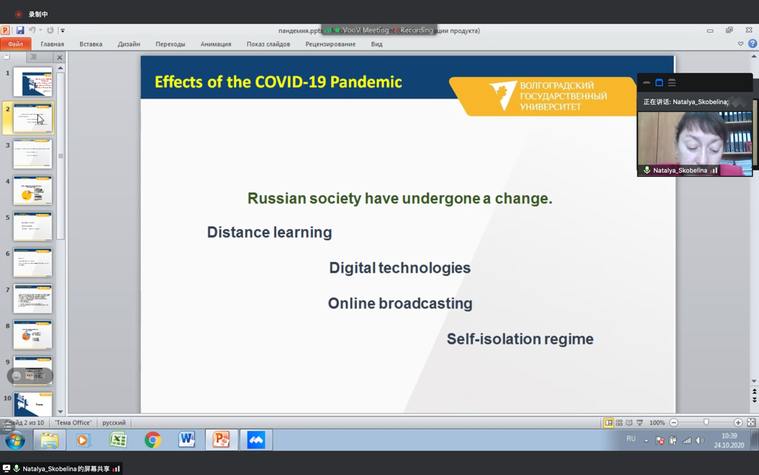 最后,芦恒副院长进行会议总结。在新冠疫情的影响下,人们的生活和工作发生了巨大的改变。经济衰退、人口失业、健康危机等社会问题不断出现,使得各国社会治理、经济发展、人口流动面临危机与挑战。在此背景下,开展“现代社会与新冠疫情”国际研讨会具有十分重要的学术价值和现实意义。在风险社会的视域下,新冠疫情是人类面对的共同挑战,需要国际社会携手应对。作为社会学者,加强疫情研究、进行国际交流、不断总结经验,在全球抗击疫情中贡献自己的一份力量。这是伏尔加格勒国立大学社会学与社会技术系与H视频