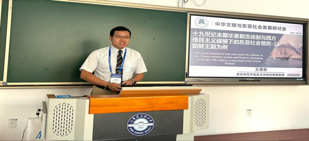 黄冈师范学院政法学院王善航副教授作了题为《十九世纪末期华夏朝贡体制与西方殖民主义碰撞下的东亚社会情势——以朝鲜王朝为例》的报告。他认为,19世纪,高宗时期的朝鲜王朝开始在清廷与日本的压力夹缝谋求国家自主发展之路,继而不断在既有礼制历法的朝贡体系及巧取豪夺与合约精神的殖民主义之间游移,进而采行对冲理论的外交策略。从社会角度来看,列强的进驻,不仅打开了朝贡体系封闭的循环,也激起东亚诸国开港开市,进行了各自的自强运动,东西文化的对撞交融也由此不断深化。