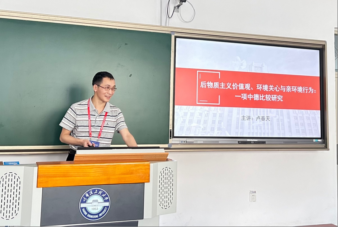 西安交通大学人文社会科学学院社会学系主任卢春天教授作了题为《亲环境行为及其影响机制——一项中德的比较研究》的报告。他从中德两国社会文化环境的差异出发介绍两国亲环境价值观念、态度与行为的差异,以及后物质主义价值观如何通过环境态度影响居民的亲环境行为。研究发现,中国居民倾向于更加温和、保守和私人性质的环保行为,环境态度的中介作用也更加强烈。