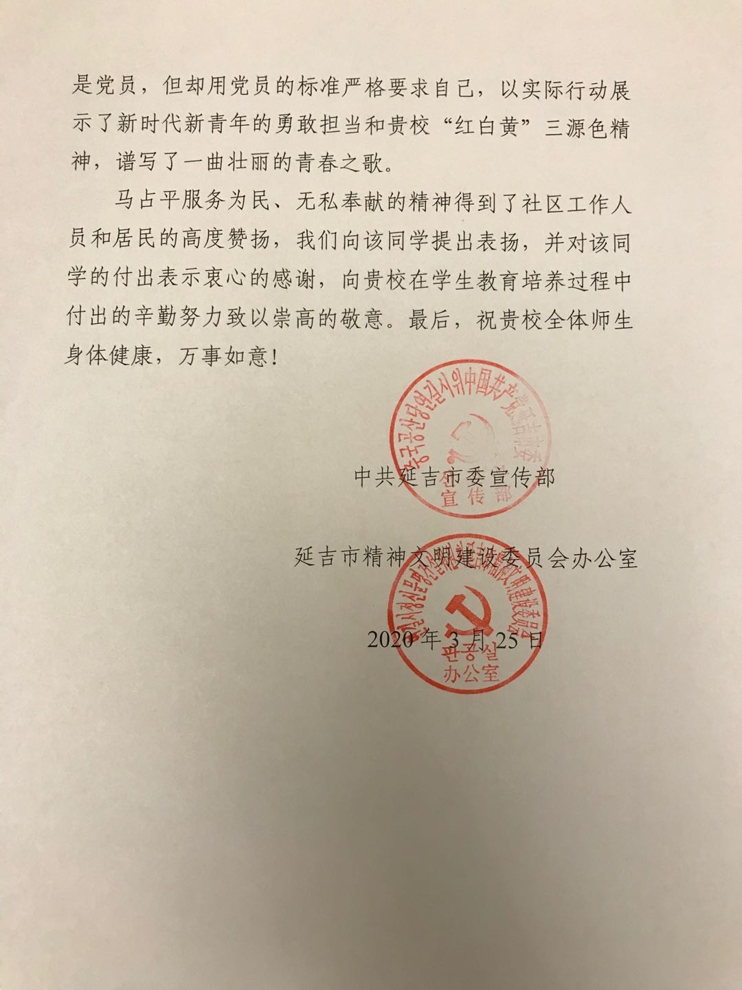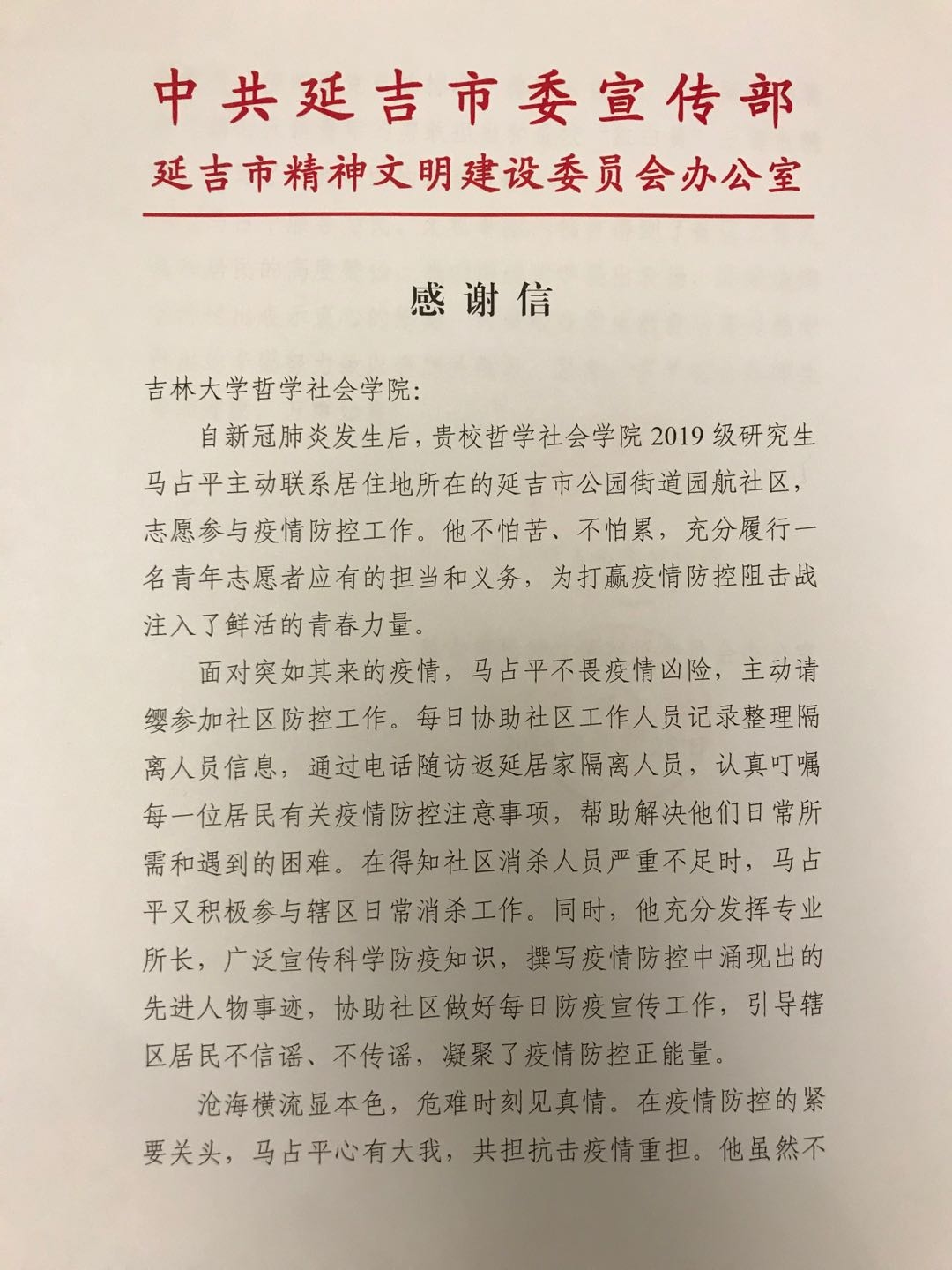 2019级马克思主义哲学研究生马占平主动联系居住所在地吉林省延吉市公园街道园航社区,志愿参与疫情防控工作。他不怕苦不怕累,主动参与防疫宣传、社区人员登记排查、安检消毒、心理咨询等工作,他服务为民、无私奉献的精神赢得了社区工作人员和居民的高度赞扬,以实际行动展现了吉大学子新时代新青年的勇敢担当。延吉市委宣传部、延吉市精神文明建设委员会办公室2020年3月25日向学院发来感谢信,向该同学提出表扬,对该生表示感谢,向学校在学生教育培养过程中付出的努力致以崇高的敬意。
