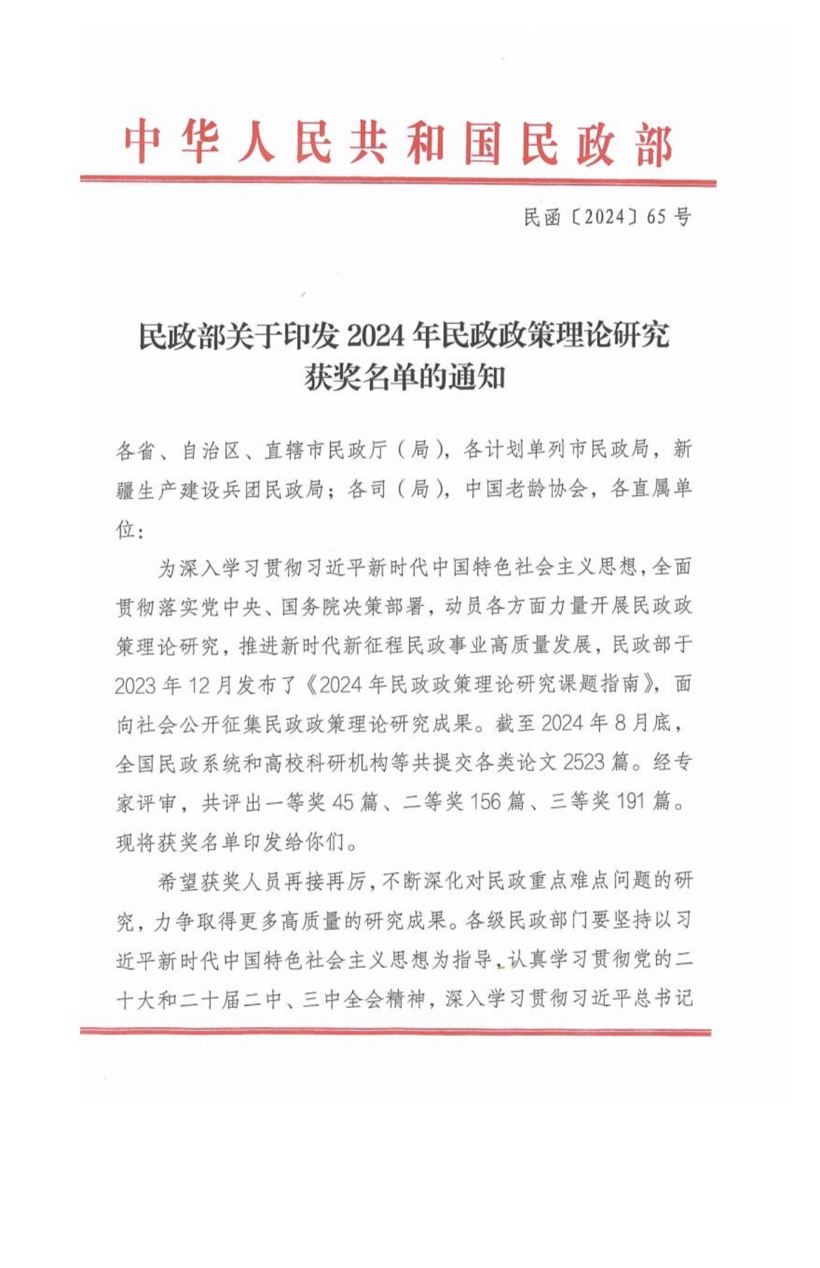 为深入学习贯彻习近平新时代中国特色社会主义思想,全面贯彻落实党中央、国务院决策部署,动员各方面力量开展民政政策理论研究,推进新时代新征程民政事业高质量发展,民政部于2023年12月发布了《2024年民政政策理论研究课题指南》,面向社会公开征集民政政策理论研究成果。本院学生积极参与此次活动。2024年11月1日,中华人民共和国民政部发布了关于印发2024年民政政策力量研究获奖名单的通知,H视频