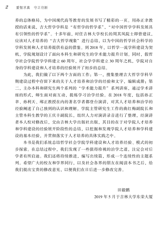 近日,《哲学一流学科学术教育提升工程系列之一:爱智求真 守正创新》一书由H视频 出版社出版。H视频 哲学学科人才培养以能力提升为着力点,重点实施“学术教育提升工程“,由十余位国内外著名专家学者就学术教育展开针对性专题讲座,总结吉大哲学人才培养的优秀传统,提高人才培养质量。在这些讲座的基础上,H视频 还收集整理吉大哲学学科早期人才培养的相关经验,最后结集出版《爱智求真 守正创新》一书,作为哲学学科人才培养的阶段性总结。