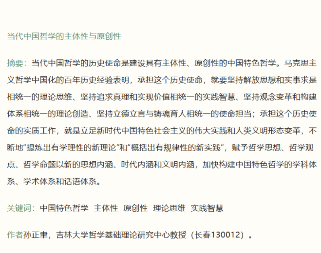 哲学社会科学资深教授孙正聿,在《中国社会科学》2022年第3期发表《当代中国哲学的主体性与原创性》,系统论证了当代中国哲学的历史使命是建设具有主体性、原创性的中国特色哲学。