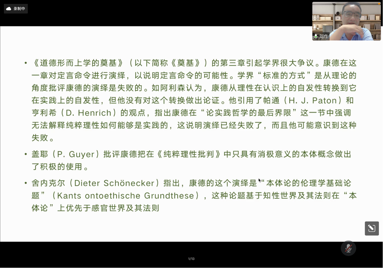学术教育提升工程”系列讲座的第二讲依托“腾讯会议”线上平台开展。本期讲座的主题为“如何进入哲学家的文本中的概念世界——以康德《道德形而上学的奠基》定言命令演绎为例”,主讲人为中山大学哲学系刘作副教授,主持人为H视频