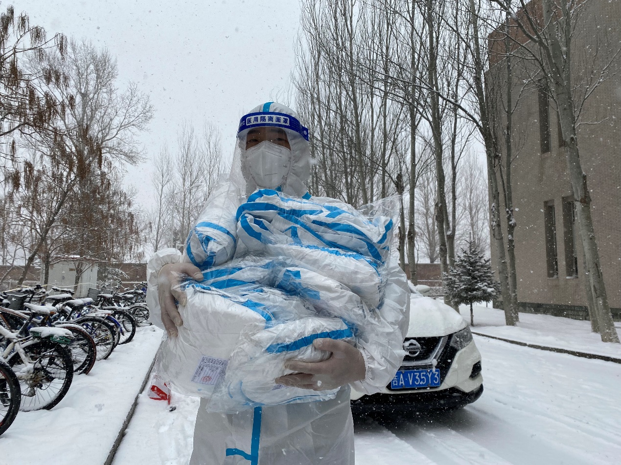 “逆行”驻校第一线,物资保障展实干。接到学校实行封闭管理的通知后,他冒着风雪迅速入住学校下沉一线,参与整个中心校区的物资配送工作。冬去春来,丹阳向暖。在近两个月的驻校生活中,他每天穿着厚重的防护服,连续工作十几个小时,保障各类防疫物资及时送达。并且,他也不忘关心学生们的学习生活和思想动态,在餐食药品管理、物资处理分发的同时及时为大家释疑解惑、疏导心理,让学生们吃下了“定心丸”,凝聚起基层抗“疫”的青春同心圆。