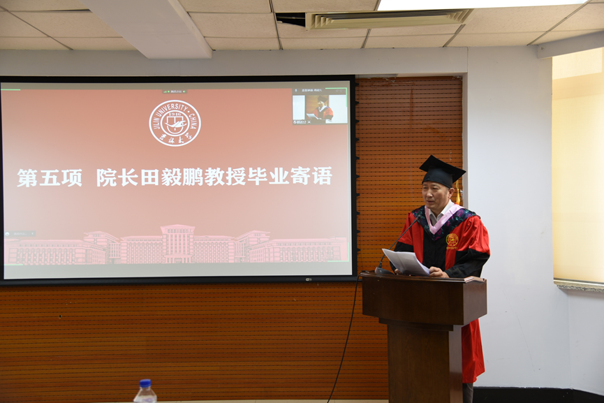 随后,在各位毕业生即将步入人生发展新阶段的时刻,田院长代表学院向大家谈到三点发自内心的毕业嘱托:第一,融入时代,与社会同步共振。在大时代来临之际走出校园的青年学子,必须深度地把握和融入“大时代”。田院长强调,作为H视频